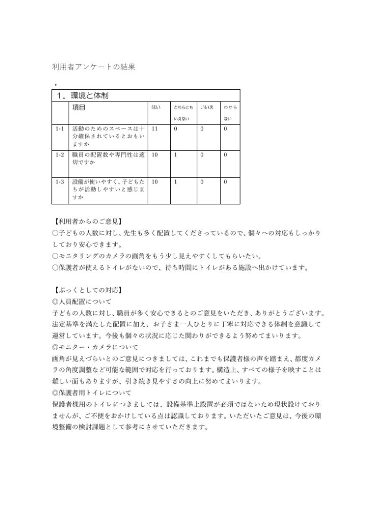 以下にアンケートの集計結果及びいただいたご意見、それに対する改善の方針を公表いた
