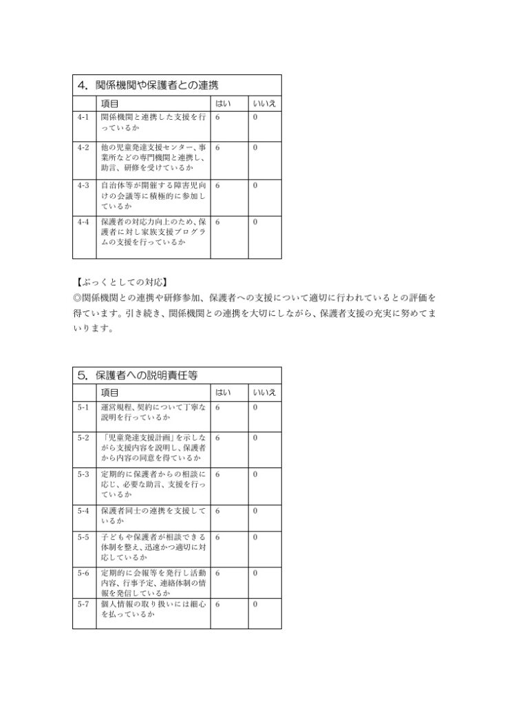 る評価項目が規定され、児童発達支援を行う事業所はそれに基づく評価を、利用者、職員が