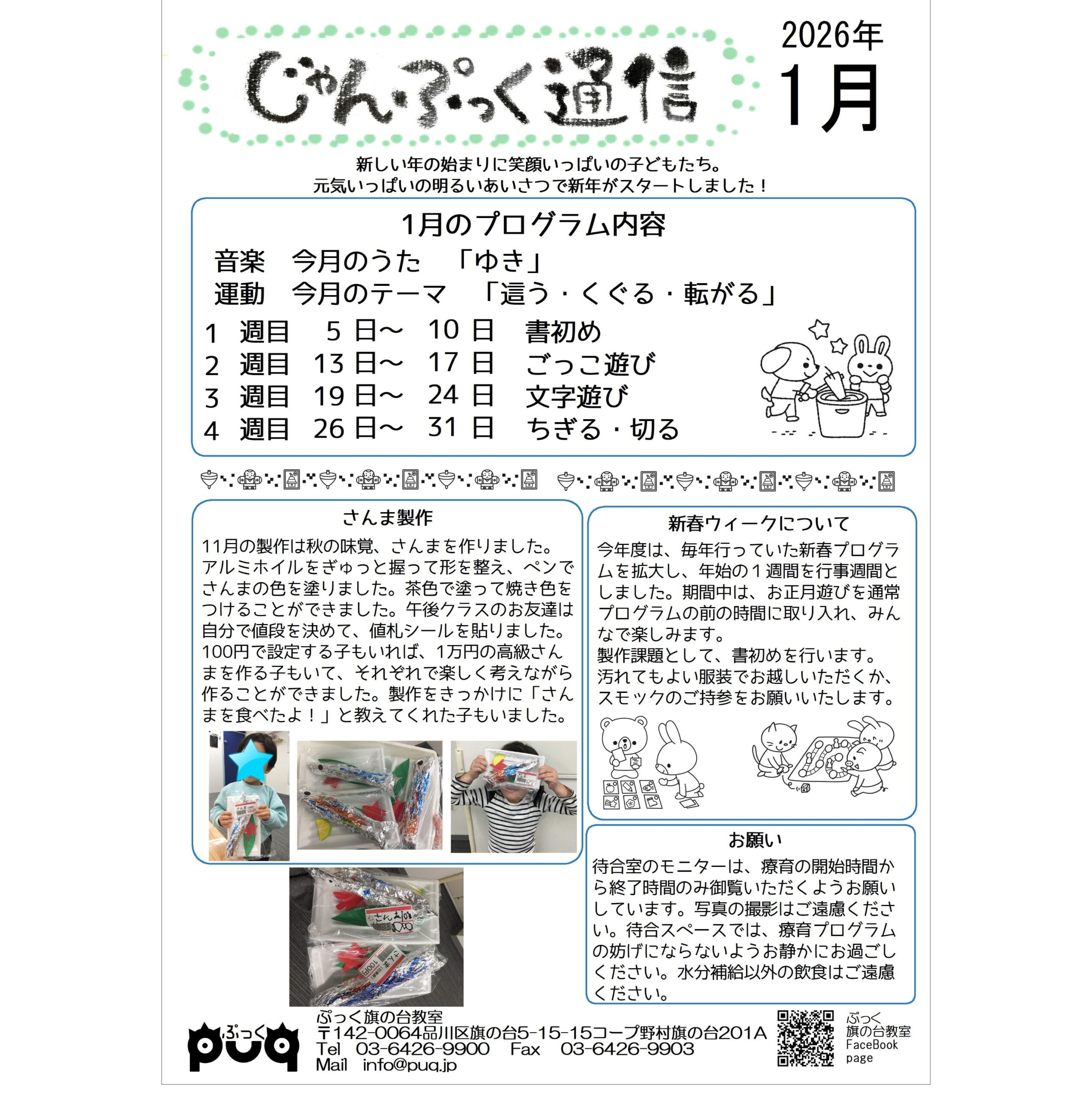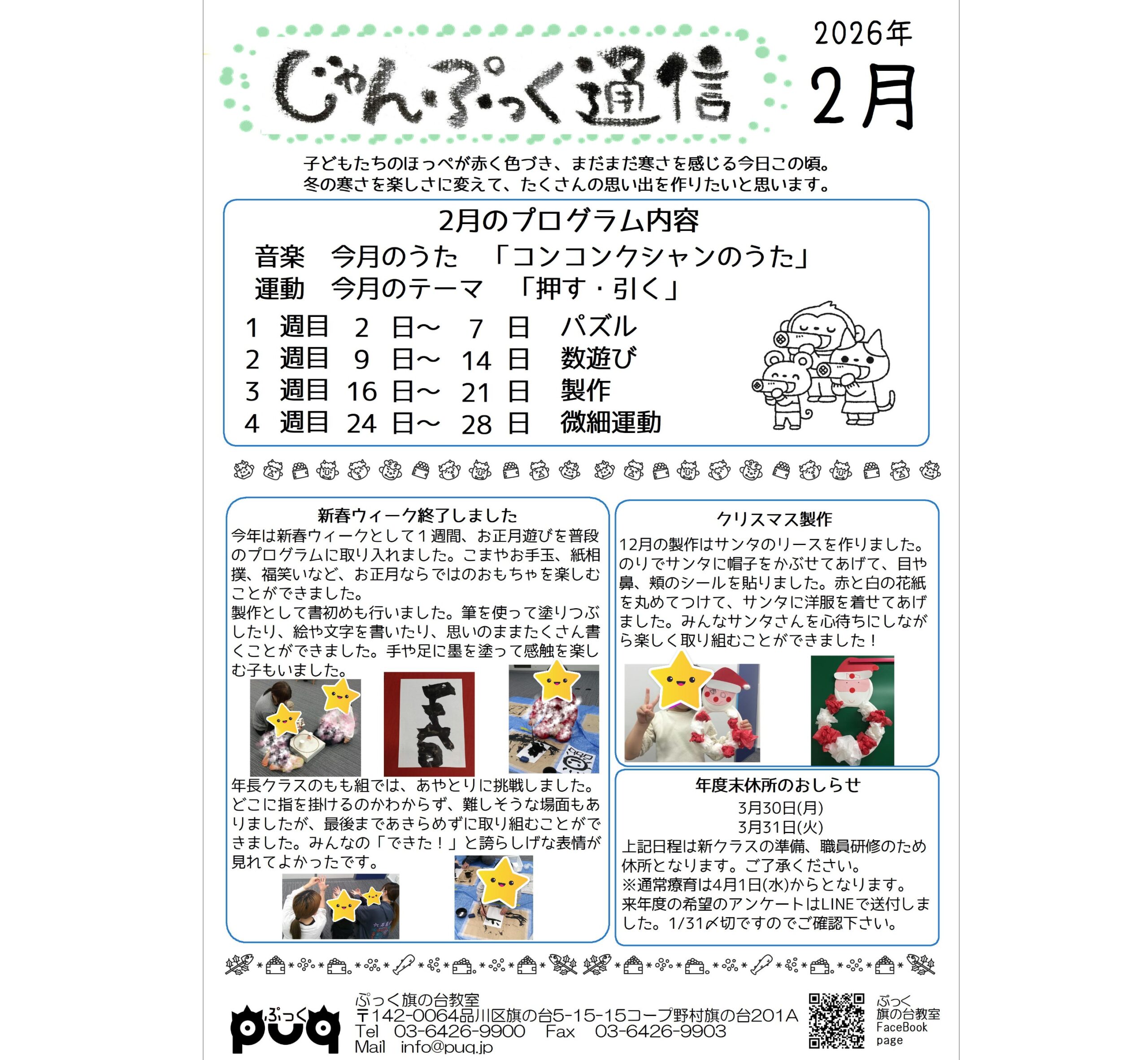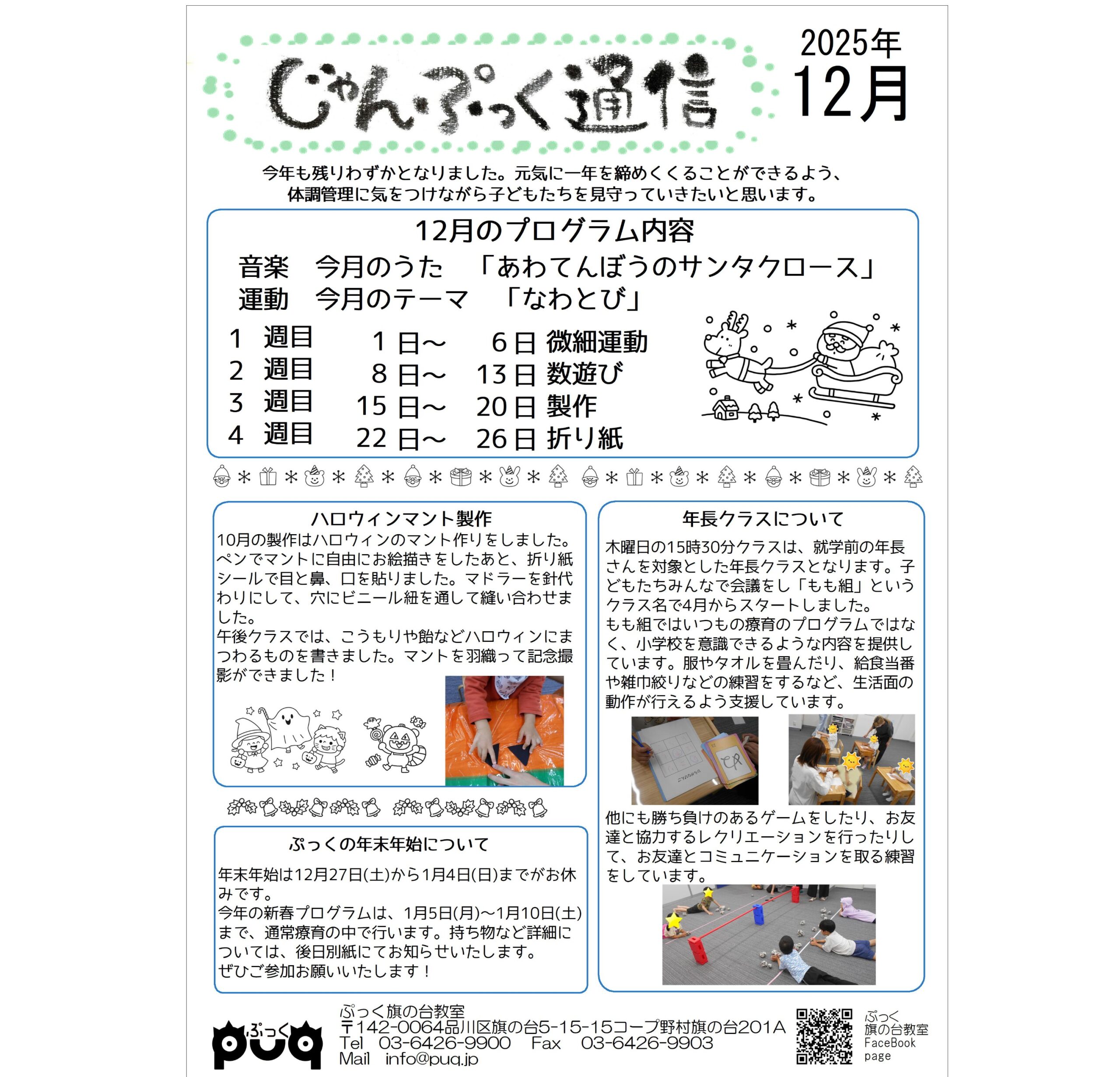 ぷっくのおしらせ12月号です。年末年始は12/27から1/4まで冬期休業とさせていただきます。振替がご案内できる日時もございますので、事前にご相談ください。また、ご家族の冬休みなどで療育をお休みする予定の方も、振替クラス […]